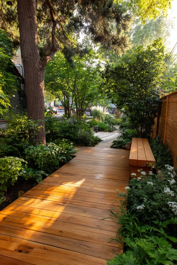This design turns a floating deck into a beautiful walkway, guiding you through lush garden planting with warm wood boards underfoot. The deck sits lightly above the ground, creating a gentle path that feels both functional and decorative.