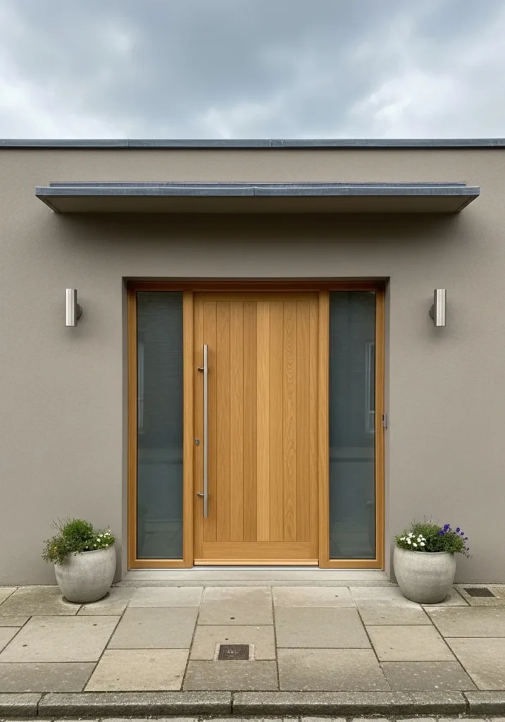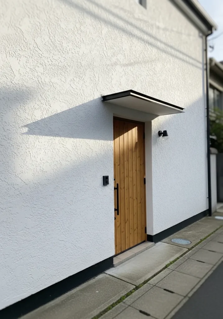This terrace entrance features a light beige facade with a natural wood door centered beneath a subtle flat canopy. Two small potted plants sit symmetrically on either side, adding softness to the clean lines. The design feels balanced and intentionally simple.