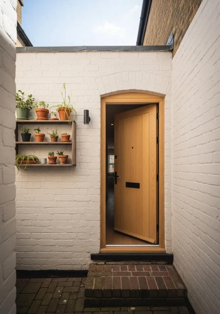 A slim terrace entry framed by white painted brick includes a wooden door and small wall mounted shelves holding potted plants. The brick texture adds charm, while the greenery softens the narrow space. It feels intimate and thoughtfully styled.