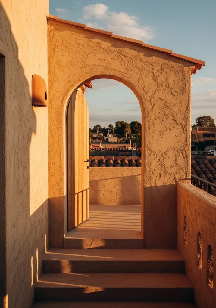 An open arched terrace walkway leads toward a softly lit wooden door, with warm stucco walls glowing in golden light. The curved architecture frames the sky beyond, creating depth and a dreamy atmosphere. The neutral palette keeps everything cohesive and serene.