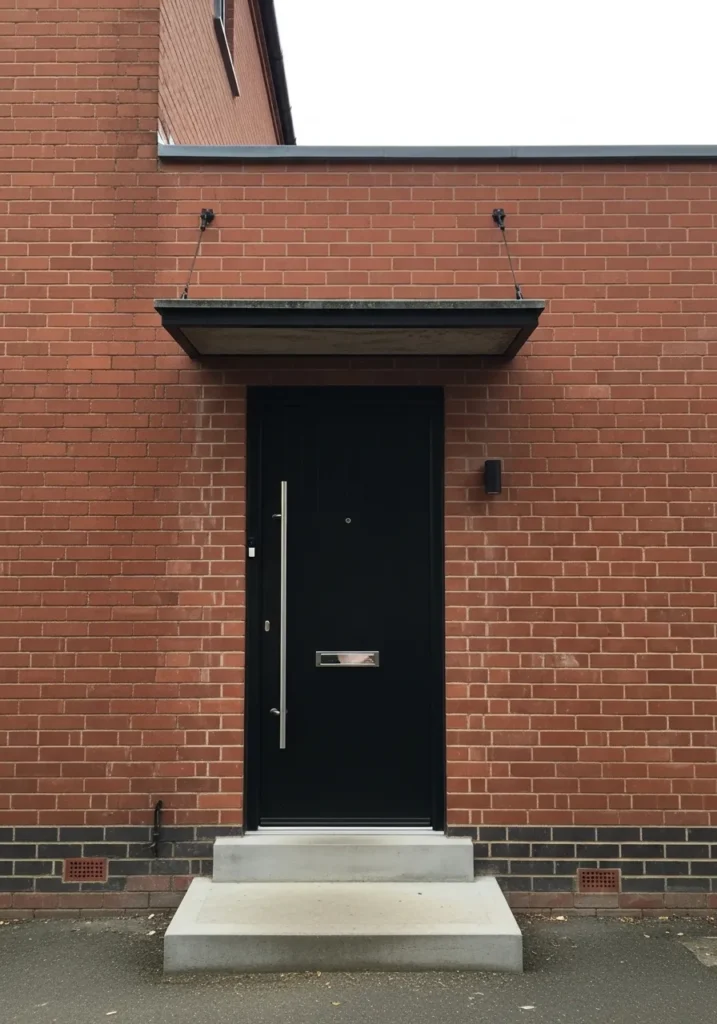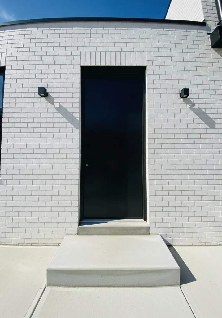 Red brick surrounds a sleek black door, with a slim black metal canopy mounted above. The brick texture brings warmth and authenticity, while the door keeps the look sharp and contemporary. The simplicity of the facade allows the materials to shine.