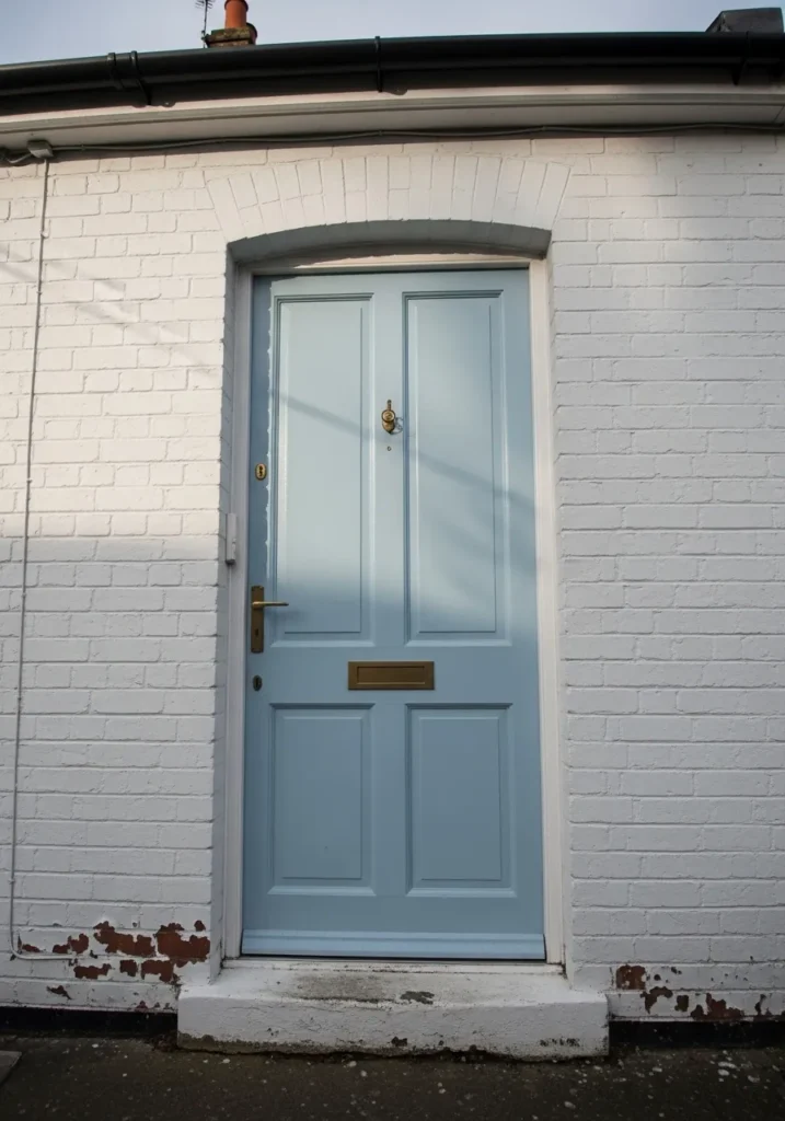 Here we have a soft powder blue door set against white brick, complete with a classic mail slot and subtle molding details. The slightly raised step and curved top frame add a traditional touch, while the muted color keeps it feeling fresh. The proportions are charming and perfectly suited to a cozy terrace home.