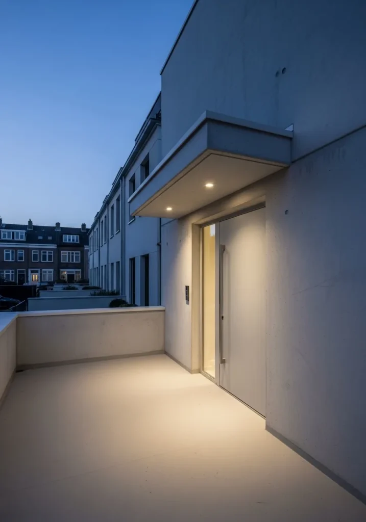 This entrance shows a minimalist white exterior with a flush door and subtle recessed lighting under a slim overhang. The clean terrace walkway stretches out in front, and the warm indoor light spills softly through the glass as dusk sets in. The lines are sharp, and the palette stays neutral and refined.