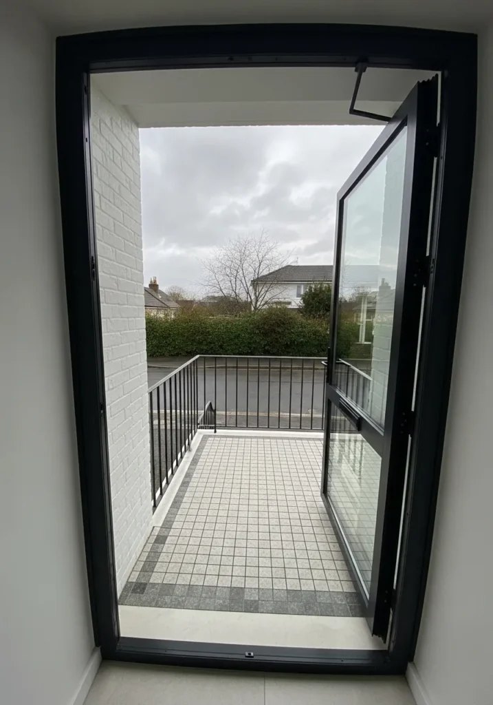 This terrace entrance captures a glass door swung open toward a small balcony space beyond. The slim black frame and clear panels keep the look airy and contemporary. Light pours through, highlighting the clean flooring and simple railing outside.