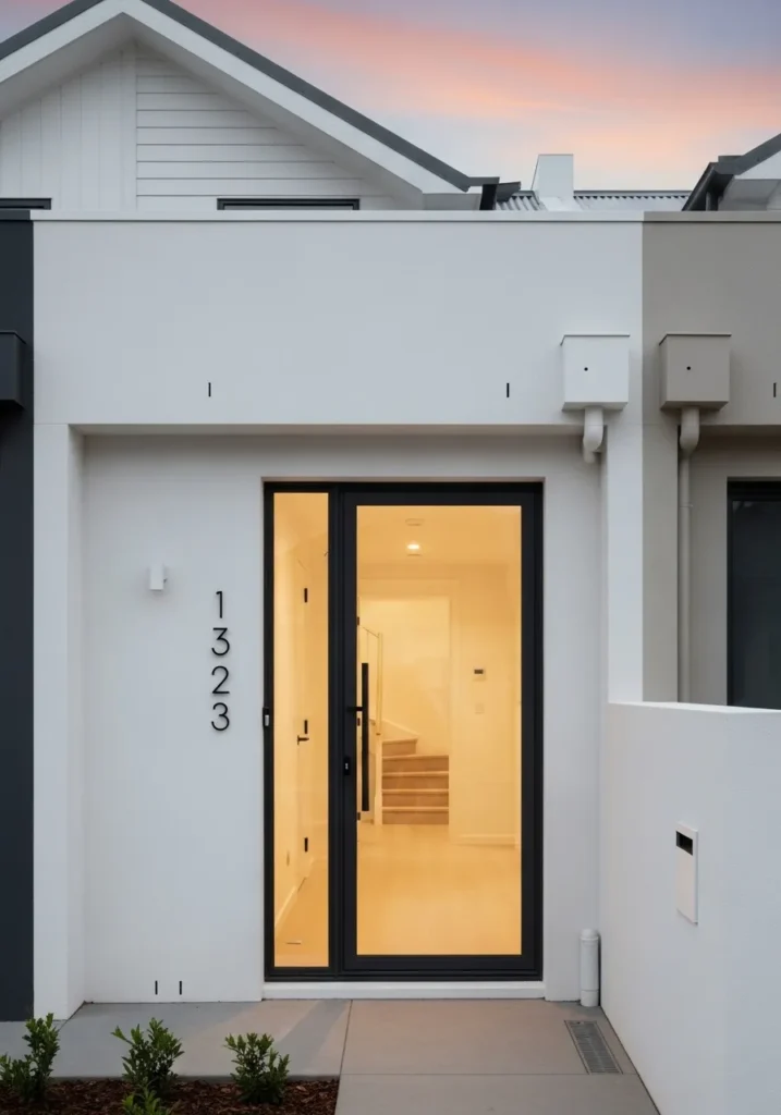This terrace entrance showcases a modern white facade with a tall glass panel door framed in black. The clean lines and flat roof detail keep everything minimal, while the soft interior lighting adds warmth. The small step and subtle landscaping complete the look.