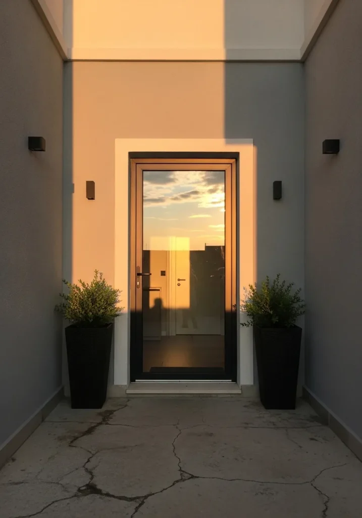 Here we see a sleek glass panel door framed by soft gray walls, glowing with warm sunset light. Two tall black planters sit symmetrically on each side, giving the narrow entry walkway a balanced and intentional look. The stone floor adds a slightly rustic touch, while the reflection of the sky in the glass makes the space feel deeper.