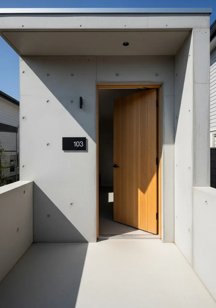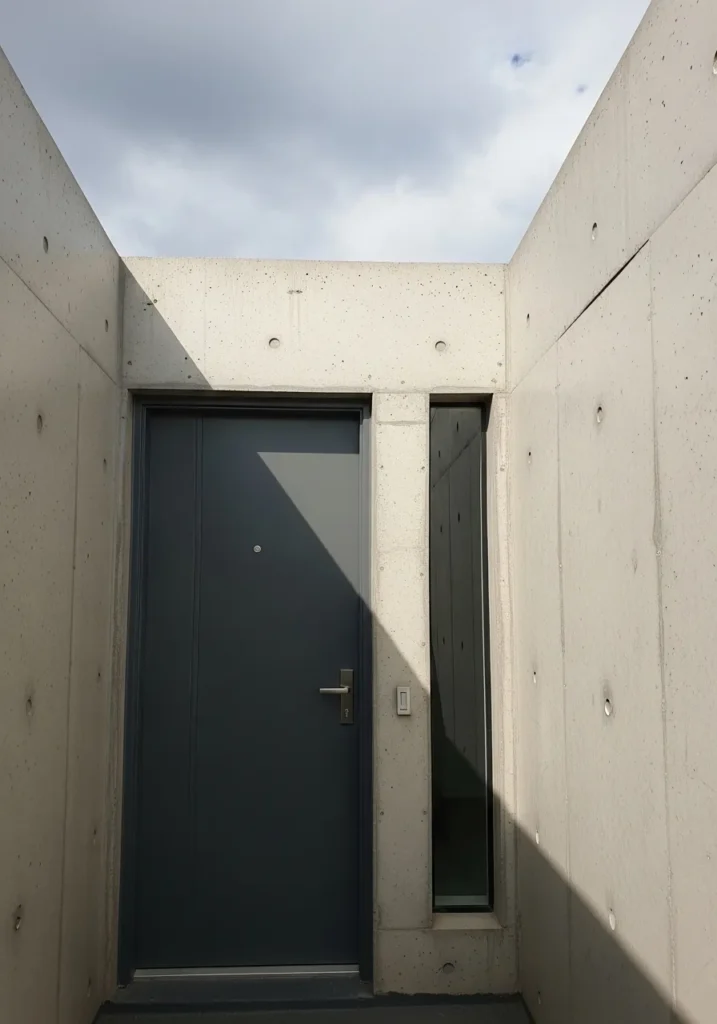 This entrance embraces raw simplicity with smooth concrete walls and a solid dark door. The lines are straight and bold, and the narrow vertical window beside the door adds just a hint of light. The overall look is understated and architectural.