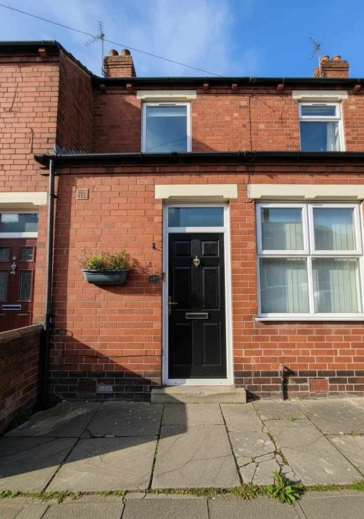 This traditional terrace home features rich red brick and a glossy black door centered beneath a white lintel. The brick texture brings warmth and authenticity, while the simple layout keeps the entrance practical and welcoming.