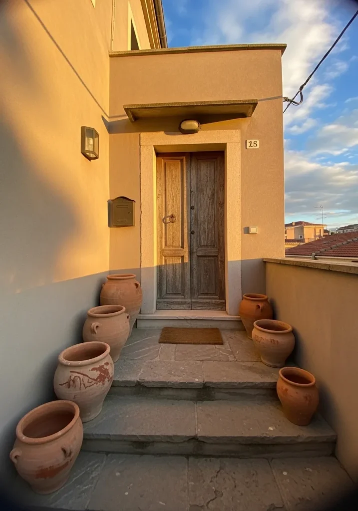 This entrance sits at the top of a small staircase lined with terracotta pots in various sizes. The warm cream walls glow in golden light, and the wooden door at the top feels inviting and intimate. The narrow terrace layout gives it a cozy courtyard feel.
