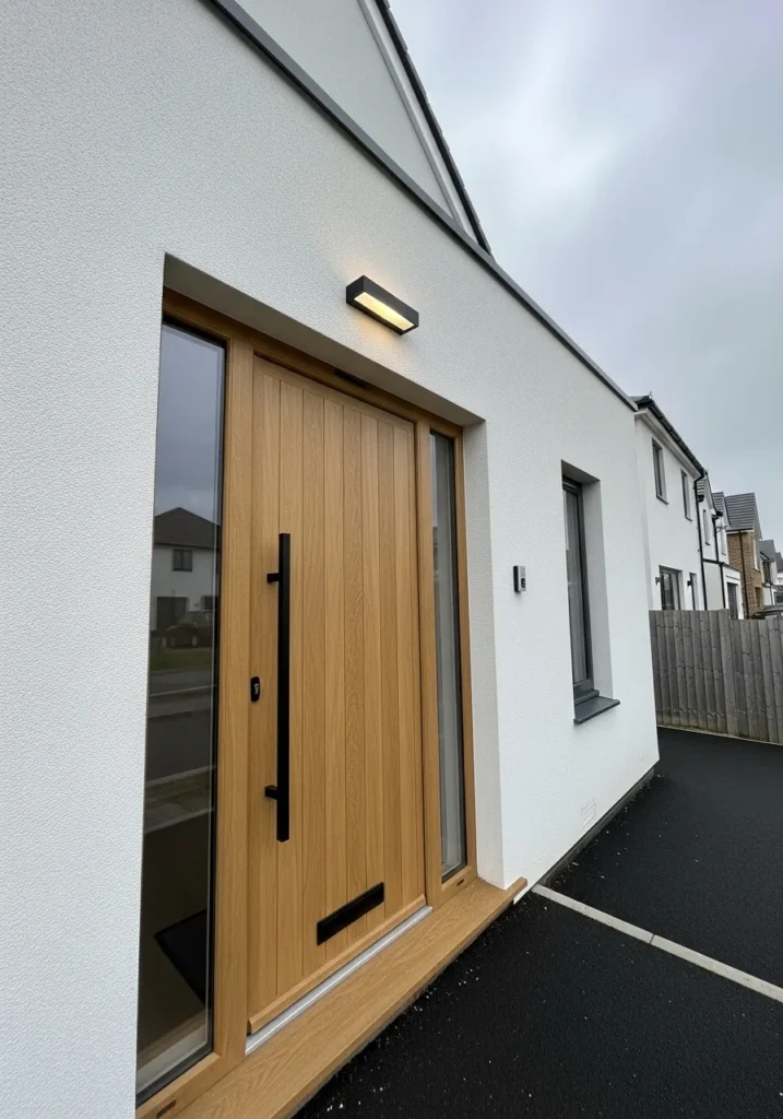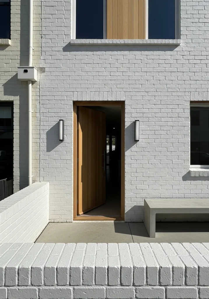 This terrace entrance blends light brick with a recessed wooden door framed by black trim. Slim wall lights add a subtle contemporary touch, and the small step keeps the proportions neat and balanced. The textures work together without competing.