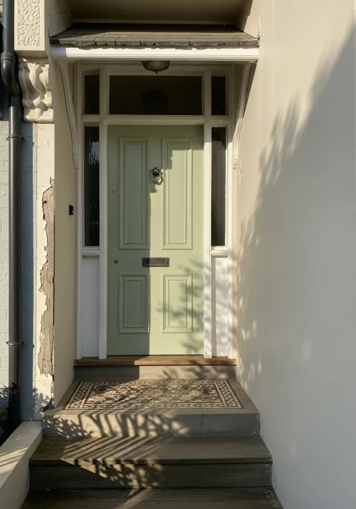 I am always drawn to pastel toned doors like this. They feel romantic without being over the top. That gentle green adds personality in such a subtle way, and it instantly makes the entrance feel more personal.