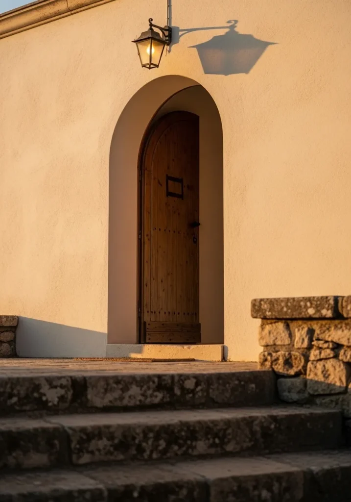 This entrance features a graceful arched doorway set into warm stucco walls. A wooden door rests at the top of rustic stone steps, with a simple lantern mounted above. The sunlight enhances the earthy tones and natural textures beautifully.