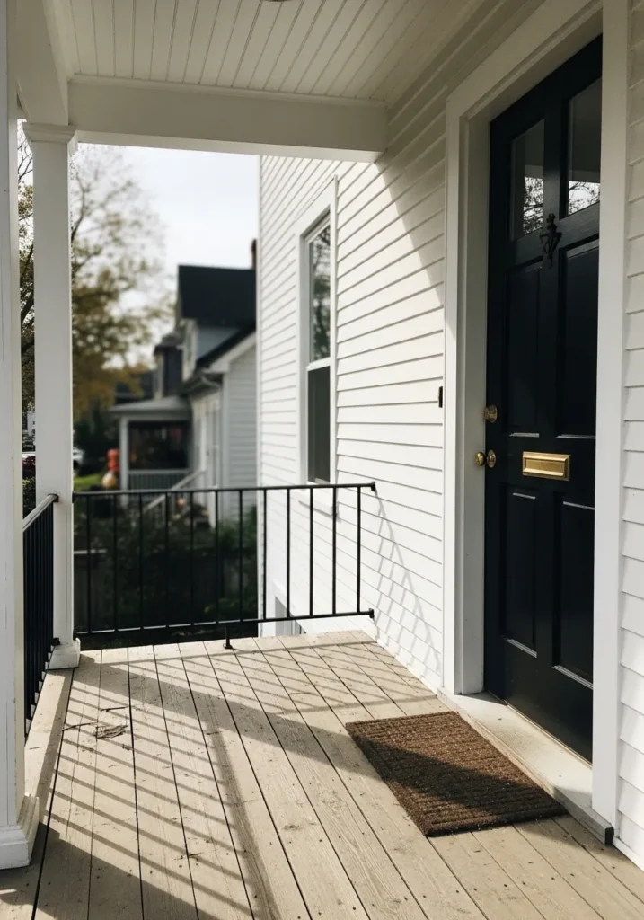 A classic black front door contrasts beautifully against white horizontal siding. The small covered porch includes simple railings and a light wood floor, creating a cozy terrace feel. Clean lines and neutral colors keep the style timeless.