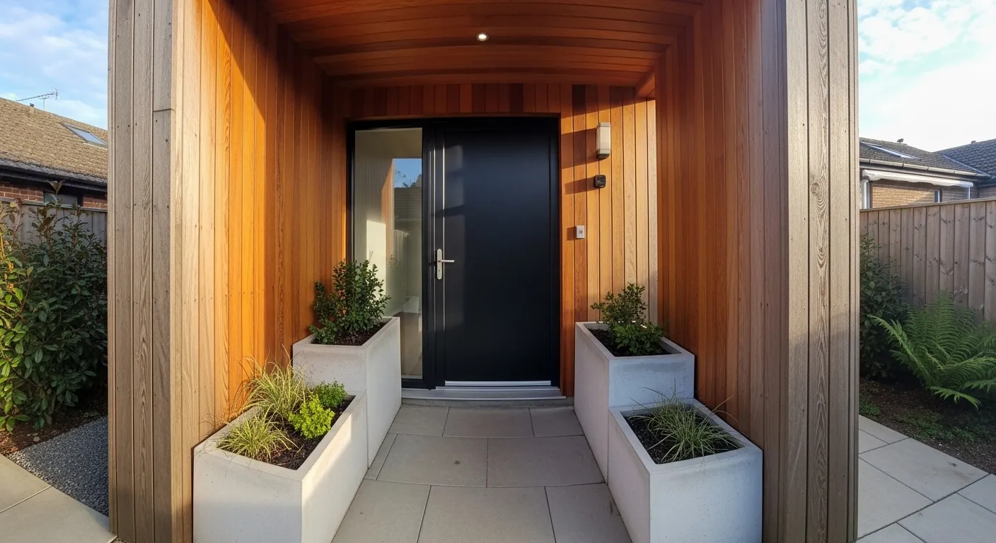 This terrace entrance is wrapped in rich vertical timber cladding, creating a cozy portal effect around a matte black door. Clean concrete planters with soft greenery line the walkway, and the black hardware keeps the look sharp and minimal. The wood grain adds depth, while the recessed ceiling light keeps the space practical and welcoming.