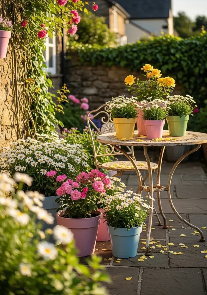 This terrace scene centers around a delicate metal bistro table surrounded by pastel planters filled with daisies, roses, and sunny yellow blooms. The flowers cluster around the seating area, softening the stone paving and creating a cozy garden nook. Gentle greenery climbs nearby walls, making the whole space feel tucked away and intimate.