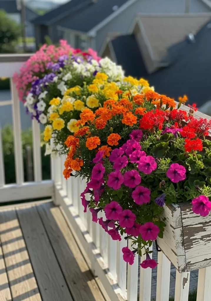 This balcony design features a long white railing planter absolutely bursting with hot pink, orange, and yellow petunias cascading over the edge. The wooden deck beneath adds warmth, while neighboring rooftops in the background remind you this is real city living. The flowers spill downward in a lush wave of color that feels joyful and bold.