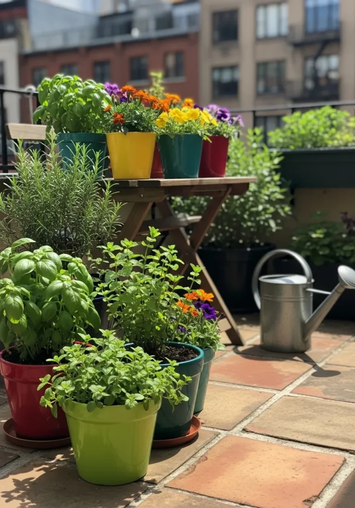 This terrace blends practical greenery with colorful blooms using lime green, yellow, and red pots arranged casually across warm tiled flooring. Fresh herbs sit alongside flowering plants, with a metal watering can tucked nearby for a lived in touch. The surrounding apartment buildings make it feel authentic and everyday.