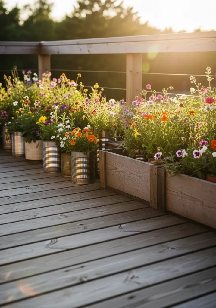 This wooden deck terrace glows in soft evening light, with long rectangular planters filled with delicate wildflowers in pink, yellow, white, and lavender tones. The blooms sway gently along the railing, catching the warm sunlight and creating a dreamy layered effect. The simple wood planks keep the focus on the flowers.