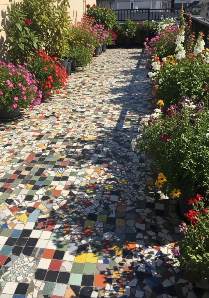This terrace features a colorful mosaic tile walkway framed by dense flower beds in bright reds, pinks, oranges, and purples. The patterned path adds visual interest while guiding you through the garden like a tiny outdoor escape. The surrounding blooms feel abundant and slightly overgrown in the most beautiful way.
