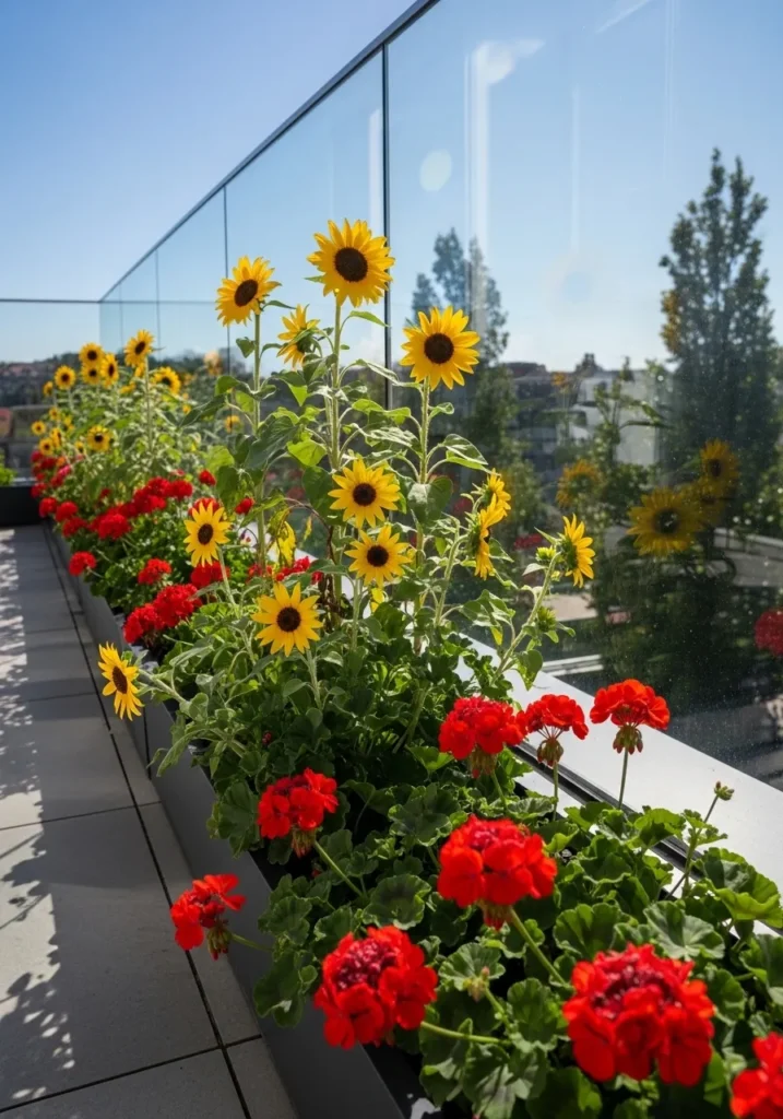 This modern terrace uses a sleek glass railing as a backdrop for cheerful sunflowers and bold red geraniums planted in a long rectangular bed. The bright blue sky above makes the yellow petals stand out even more. Clean lines and vivid blooms create a fresh and balanced look.