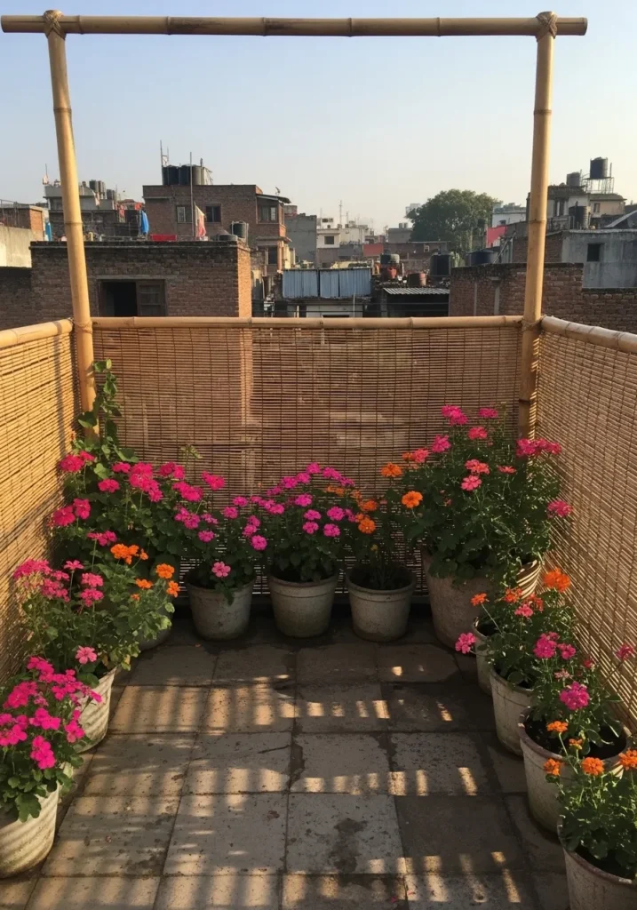 This small terrace corner is wrapped in a natural bamboo screen, creating privacy while terracotta pots filled with bright pink flowers line the base. The wooden slats cast soft shadows across the floor, and the city skyline peeks above the fencing. The space feels intimate and thoughtfully arranged.