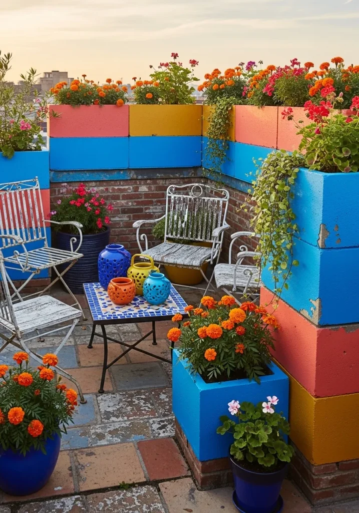 This terrace instantly grabs attention with a stacked wall of oversized planters painted in bold blocks of blue, coral, and sunny yellow. Each tier overflows with orange marigolds, pink geraniums, and lush green foliage that soften the geometric lines. A small white metal chair and café table sit nearby, adding charm without distracting from the vibrant display. The tiled floor beneath keeps the look grounded while the colorful backdrop does all the talking.