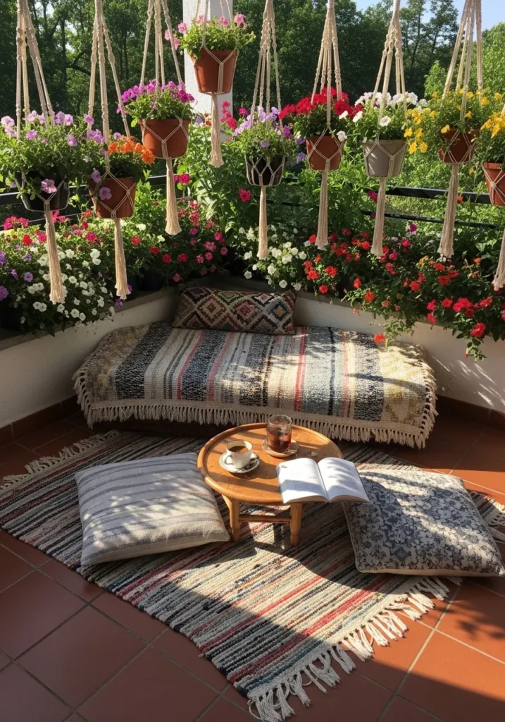 This terrace corner feels dreamy with rows of hanging baskets filled with vibrant red and pink flowers suspended above cozy floor cushions. The blooms frame the seating area beautifully, while patterned textiles add warmth and personality. The sunlight filtering through the plants creates soft shadows that make the whole space glow.
