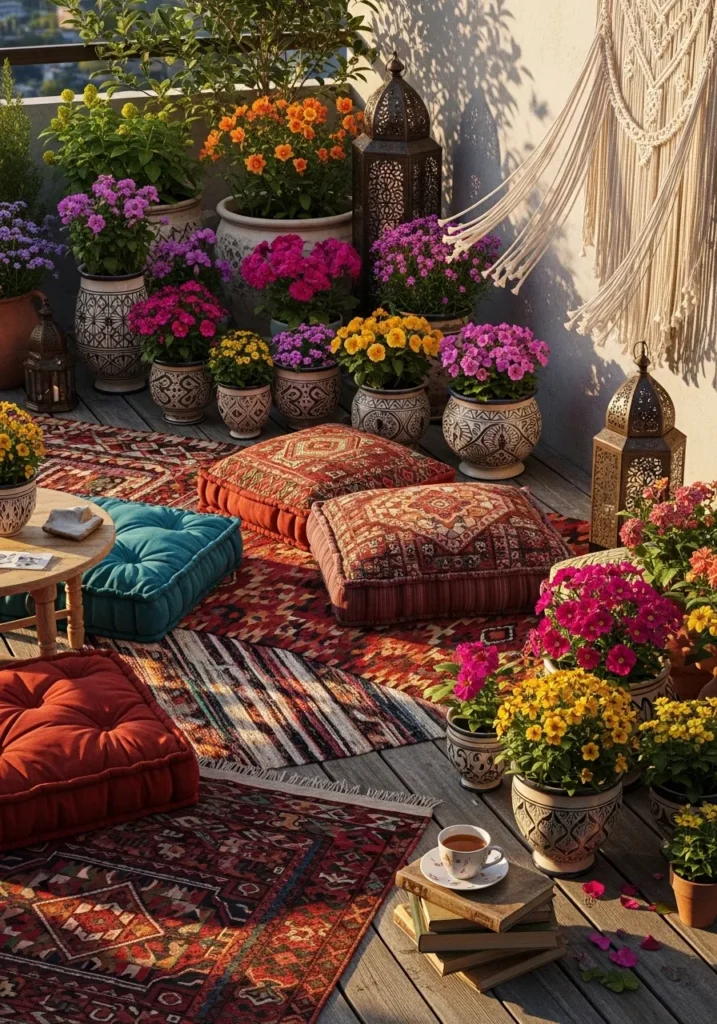 This terrace transforms into a cozy bohemian retreat layered with patterned rugs, floor cushions, and low seating surrounded by clusters of blooming flowers in every shade imaginable. Terracotta and ceramic pots hold bright yellows, purples, and pinks, while soft textiles add warmth and depth. The space feels intimate and thoughtfully styled without looking too polished.