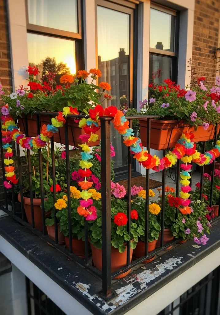 This balcony uses simple railing planters filled with bright orange, yellow, and pink blossoms, then takes it a step further with colorful floral garlands wrapped around the metal bars. The flowers cluster tightly, creating a vibrant border that frames the city view beyond. The compact layout keeps everything feeling lively without overwhelming the space.