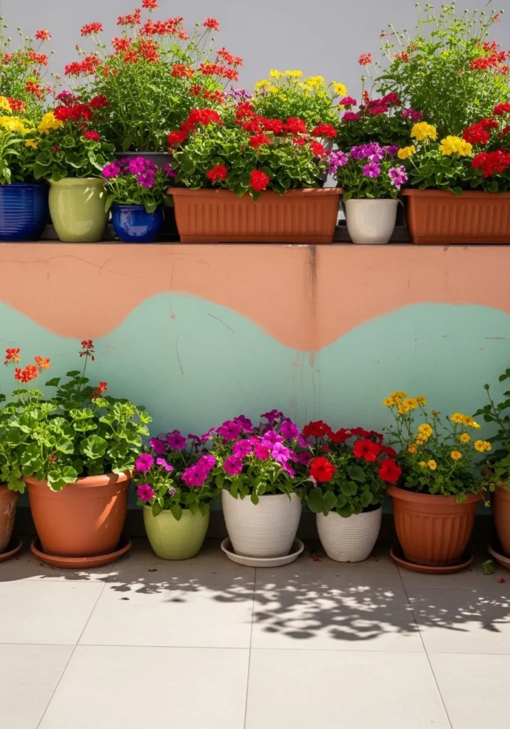 This terrace showcases a charming two level arrangement of potted flowers set against a soft pastel painted wall. The upper shelf bursts with red and pink blooms, while the lower row mixes white, yellow, and purple flowers in mismatched terracotta and ceramic pots. The curved color detail on the wall adds a playful touch without stealing attention.