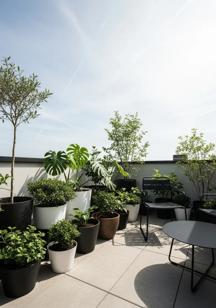 This terrace takes a more understated approach with sleek black and neutral planters arranged around a simple outdoor table. The focus is on layered greenery with subtle pops of color from small flowering plants tucked between leafy varieties. The open sky and clean flooring keep everything feeling airy and calm.