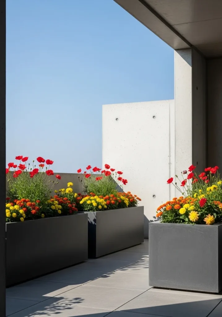 This sleek terrace keeps the architecture simple with clean white walls and smooth gray flooring, then adds vibrant red and yellow flowers in streamlined rectangular planters. The blooms sit neatly along the edge, creating a crisp contrast against the neutral setting. The open sky above makes the colors feel even more striking.