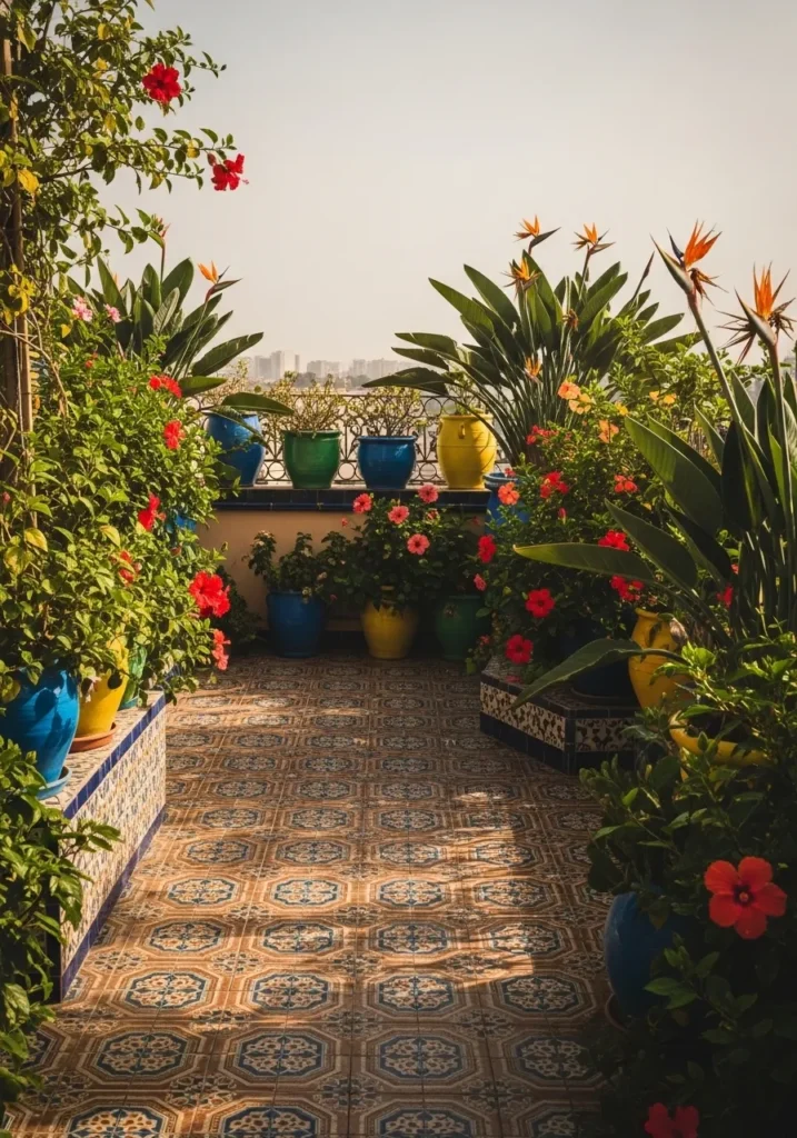 This terrace feels like a sun soaked escape with patterned tiles underfoot and large terracotta pots overflowing with orange, pink, and coral blooms. Lush greenery surrounds the edges, while the warm tile patterns ground the space with rich earthy detail. The layered plants create depth without overwhelming the walkway.