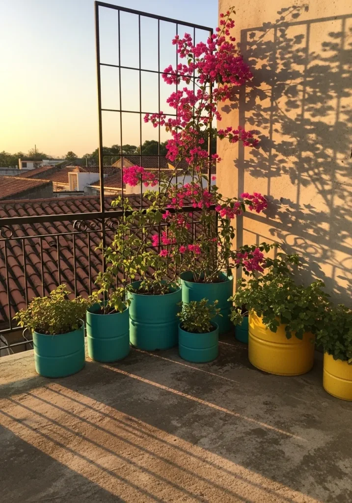 Sunset Balcony with Bougainvillea and Colorful Pots