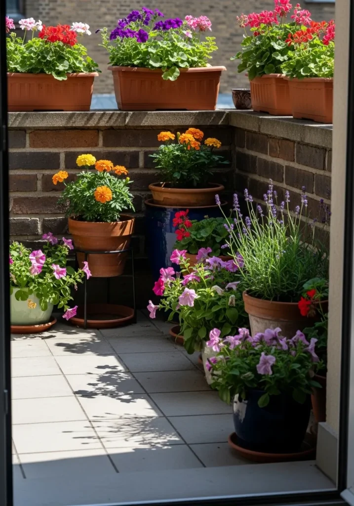 I love how even the smallest terrace can turn into a cheerful garden with the right mix of flowers, pots, and playful details.