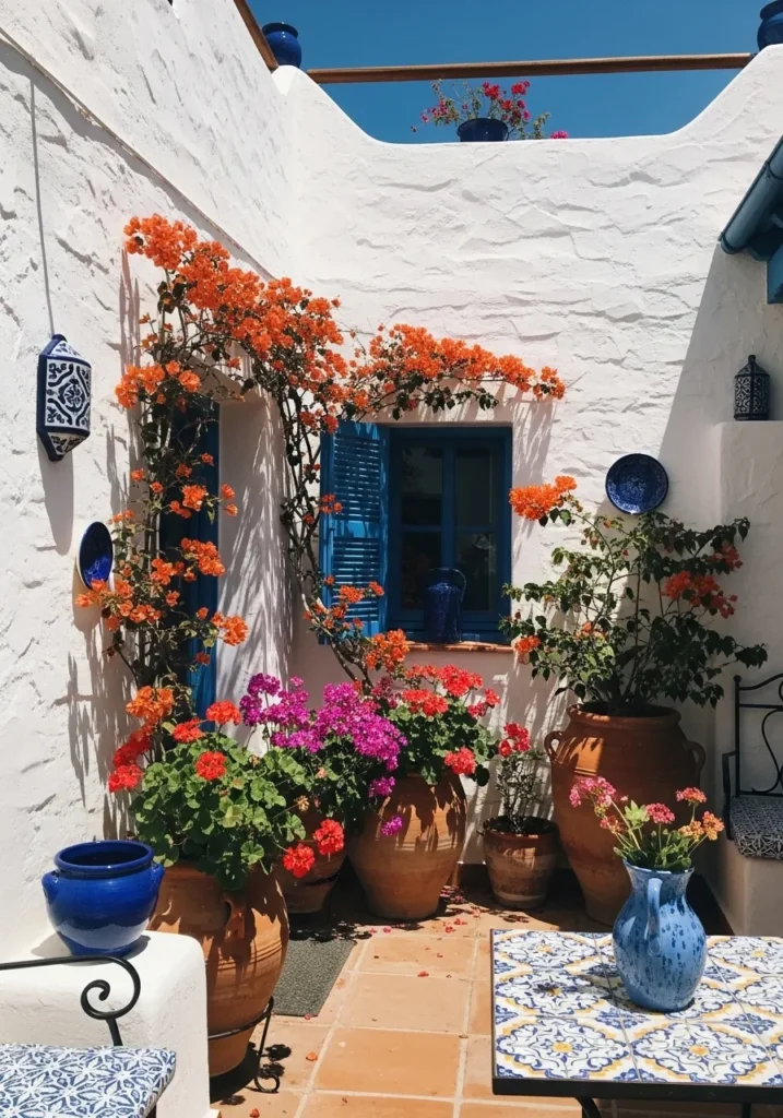 This terrace features crisp white walls, cobalt blue doors, and terracotta pots bursting with pink and orange blossoms. Climbing vines soften the edges, while patterned floor tiles add subtle detail. The contrast between the bright blooms and cool blue accents feels vibrant and balanced at the same time.