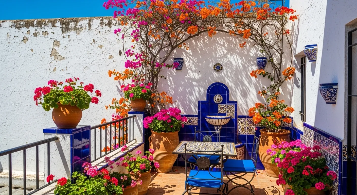This terrace features crisp white walls, cobalt blue doors, and terracotta pots bursting with pink and orange blossoms. Climbing vines soften the edges, while patterned floor tiles add subtle detail. The contrast between the bright blooms and cool blue accents feels vibrant and balanced at the same time.