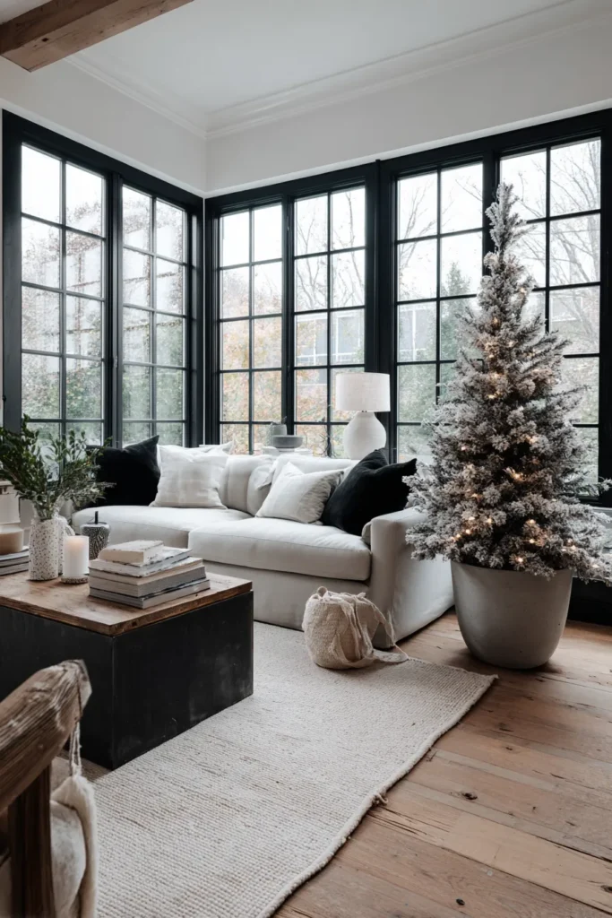 This living room is a perfect example of how black and white can still feel warm and inviting. The crisp white sofa layered with soft pillows sits against a wall of dramatic black-framed windows, letting natural light pour in. A flocked Christmas tree adds a wintry touch with its dusting of faux snow, while simple neutral accents like stacked books, candles, and cozy throws keep the room calm and balanced. The mix of wood tones and soft textiles softens the bold contrast beautifully.