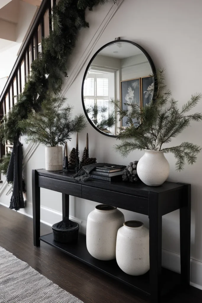 This modern entryway balances moody black furniture with crisp white accents, creating a look that feels both festive and timeless. The sleek black console holds minimalist ceramic vases in soft ivory tones filled with fresh pine branches. A round mirror with a thin black frame reflects natural light beautifully, while layered textures like books, pinecones, and candles add cozy character. The staircase garland ties it all together, bringing a subtle Christmas spirit without overpowering the space.