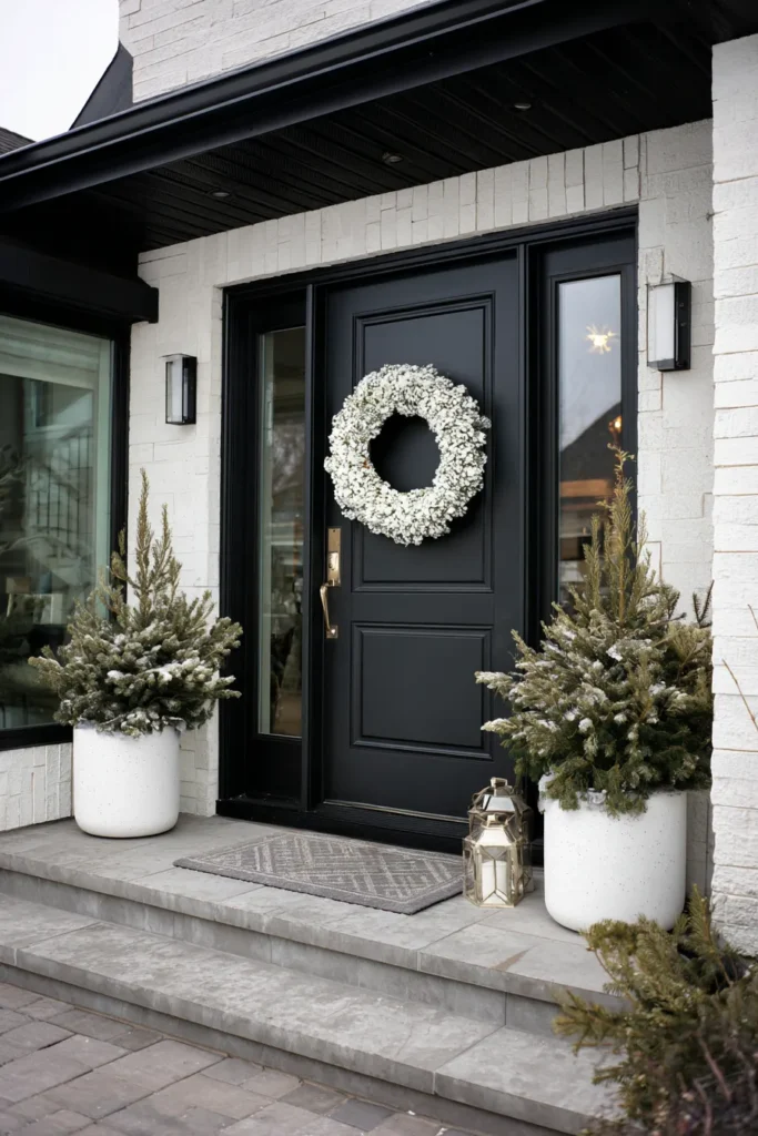 This front entryway nails the balance between bold and cozy. The matte black door sets a dramatic tone, framed by light stone brick that brightens the whole look. A fluffy white wreath instantly softens the black, adding that perfect hint of holiday charm without going overboard. On each side, potted evergreens dusted with faux snow stand tall in clean white planters, keeping the palette crisp and cohesive. A soft gray doormat and brass lantern complete the look, proving that simple details can make a big statement.