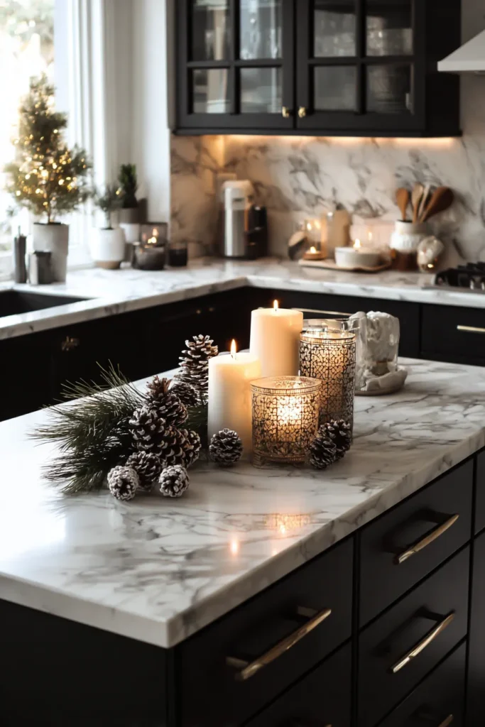 This kitchen blends modern design with cozy holiday warmth. Sleek black cabinets with brass handles contrast beautifully against the white marble countertops and backsplash, giving the space a polished, high-end feel. The centerpiece on the island features glowing candles, frosted pinecones, and evergreen sprigs that bring in subtle seasonal texture. A small, softly lit Christmas tree near the window ties it all together, casting a gentle glow across the marble and adding a magical touch to the room.