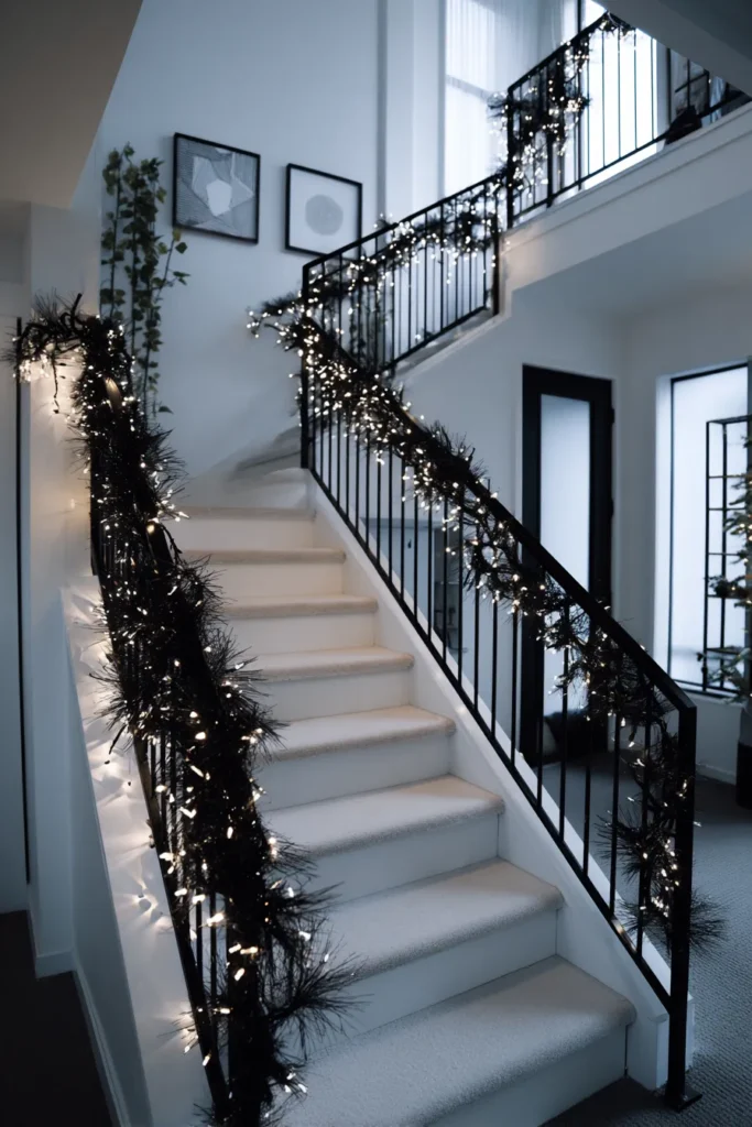 This staircase turns simple minimalism into pure Christmas magic. The clean white steps and walls create a soft backdrop that lets the black garland shine, while twinkling white fairy lights weave through it for just the right amount of sparkle. The contrast between the dark railing and the glowing lights feels bold yet serene, like something you’d see in a modern winter retreat. The whole setup keeps its elegance through restraint, using only light and texture to make a striking statement.