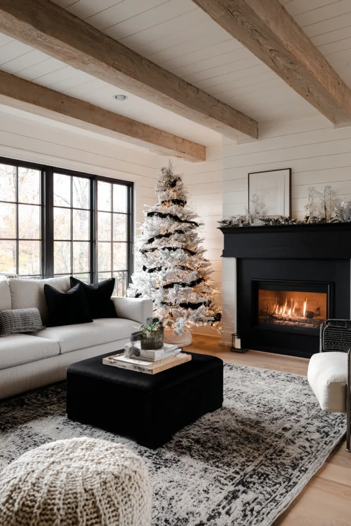 This living room feels like a dreamy winter retreat wrapped in soft neutrals and bold contrasts. The white Christmas tree sparkles beside the window, wrapped in sleek black ribbon that ties perfectly with the black fireplace and ottoman. A light beige sofa filled with textured pillows and a cozy knit pouf make the space warm and inviting, while exposed wood beams add just the right touch of rustic charm. The flicker of the fire completes the scene, giving the room a glow that feels both modern and magical.