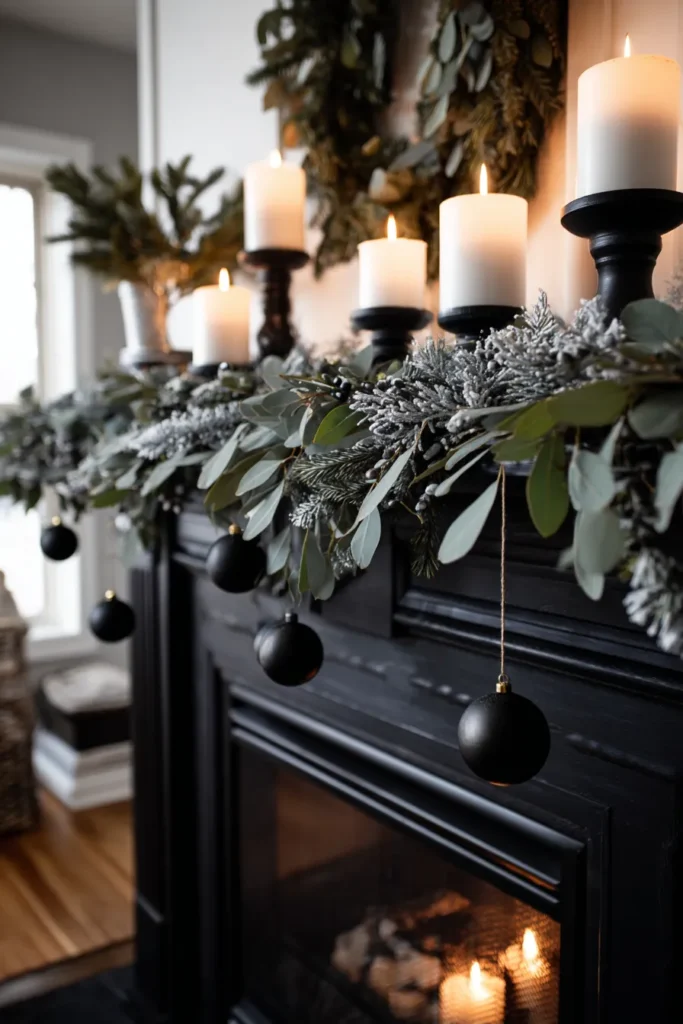 This stunning black fireplace mantel is dressed in layers of frosted greenery, soft candlelight, and matte black ornaments that hang delicately from twine. The mix of eucalyptus leaves and snowy pine branches creates a lush, full texture that feels both elegant and organic. A row of pillar candles in white and ivory stand tall on black holders, adding warmth and contrast against the dark wood. Every little detail feels intentional, from the gentle flicker of the flames to the subtle touches of silver dusting the greenery.