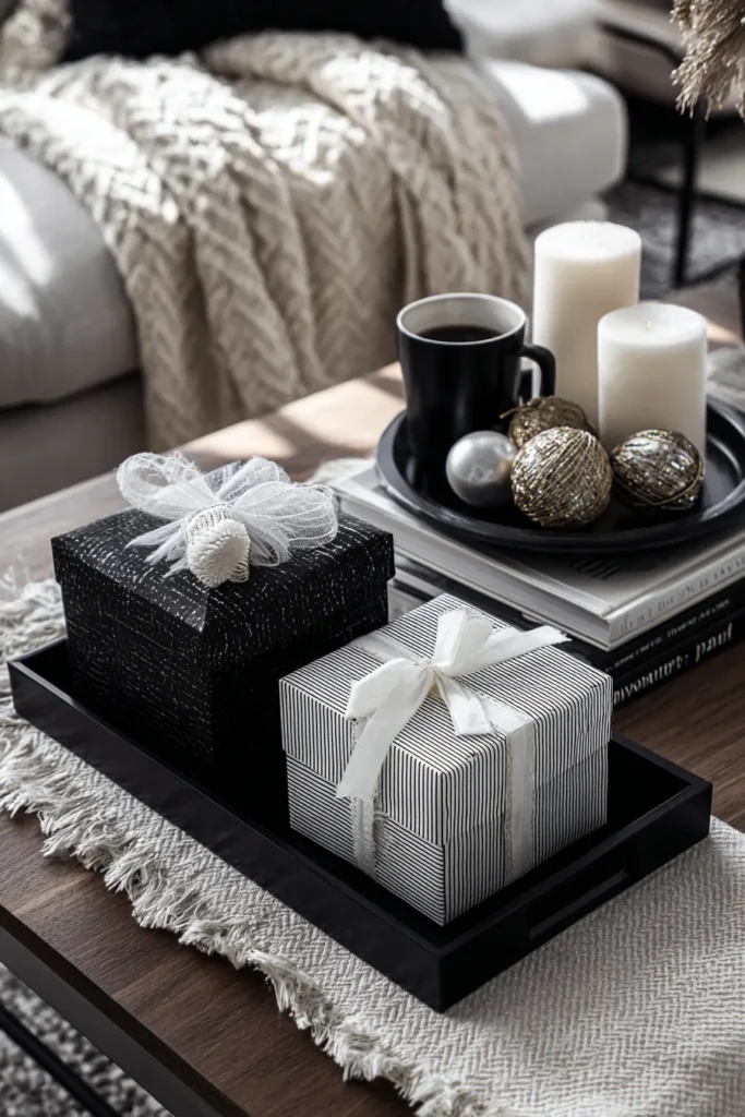 This coffee table setup is the perfect example of how less can feel like so much more. Two beautifully wrapped gifts in black and white stripes sit neatly on a black tray, their ribbons tied with care. Nearby, a small tray holds white candles, a black mug, and metallic ornaments that catch the light just enough to sparkle. The neutral woven throw underneath softens the look, creating a cozy contrast against the sleek black accents and stacked design books. Every detail feels polished yet approachable, like something you’d see in a modern holiday editorial.