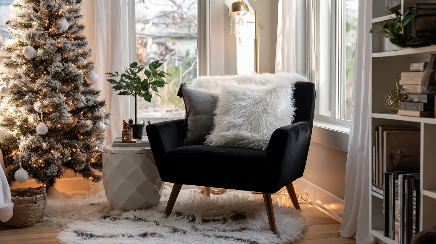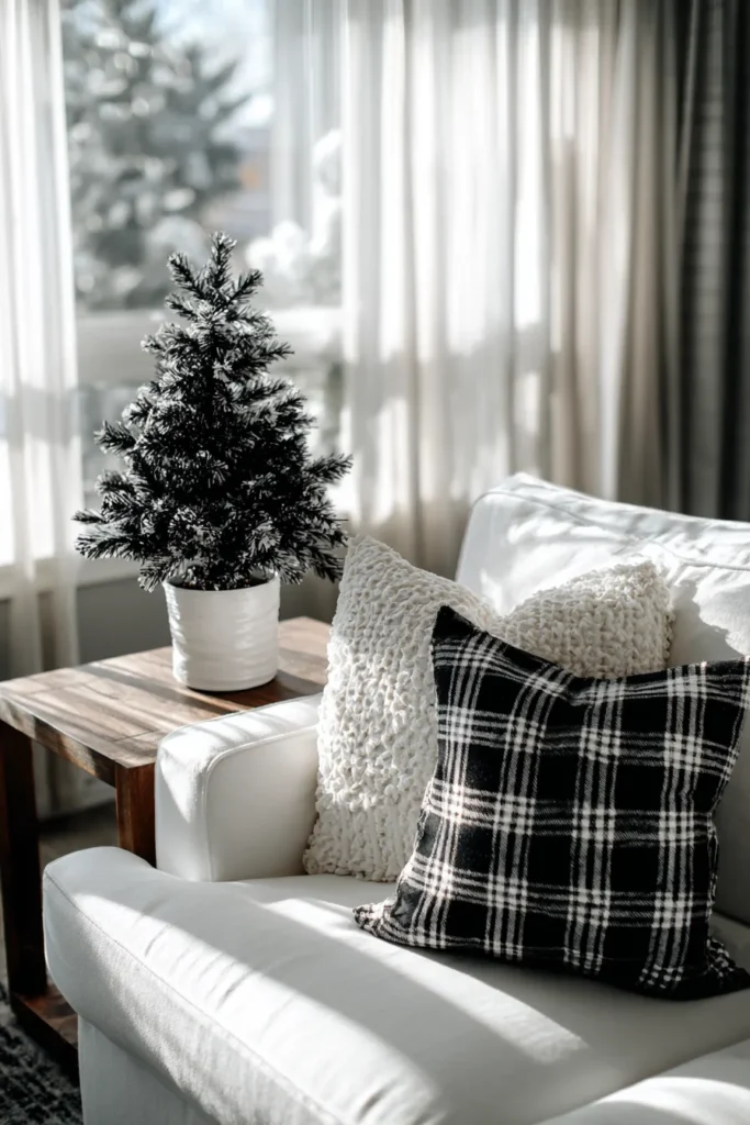This cozy corner proves that small spaces can still feel festive and stylish. A tiny black and white flocked tree sits on a wooden side table, adding just the right touch of holiday charm without crowding the room. The soft white armchair looks extra inviting with its chunky knit pillow and a black plaid cushion that ties the whole look together. Natural sunlight filters through sheer curtains, giving the setup a soft, airy feel that balances the darker accents perfectly.