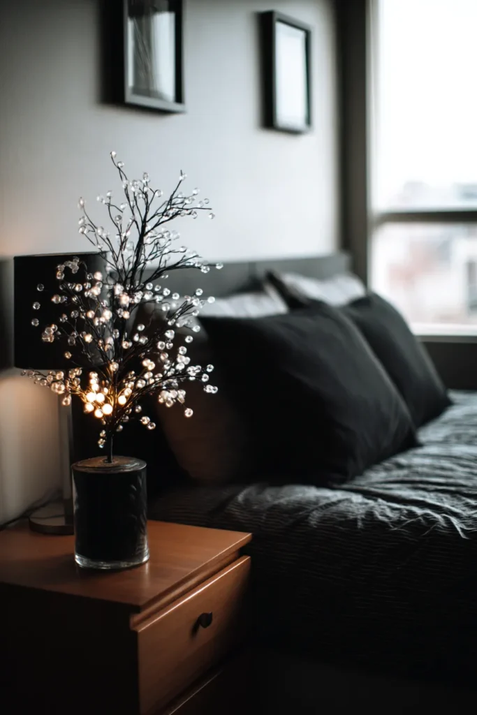 This sleek bedroom takes a modern, understated approach to holiday decorating. The dark bedding and black-framed art create a moody, cozy vibe, while the glowing branch lamp adds a soft, festive sparkle. Its delicate glass beads catch the light beautifully, mimicking snowflakes on a winter evening. The wooden nightstand brings a hint of warmth to the monochrome palette, keeping the space balanced and inviting. Every detail feels intentional, simple, and soothing.