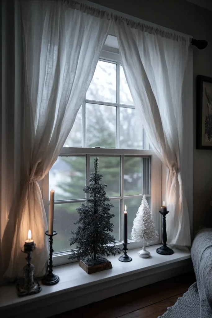 This window setup feels so soft and magical, like the calm part of winter mornings when the world outside is quiet and frosty. The sheer curtains let in just the right amount of natural light, making the black and white decor on the windowsill glow gently. Two miniature trees, one dark and one snowy white, sit side by side, framed by black candlesticks with flickering flames. The mix of textures, from the rustic wooden window frame to the cozy knit throw below, makes the whole space feel intimate and peaceful.