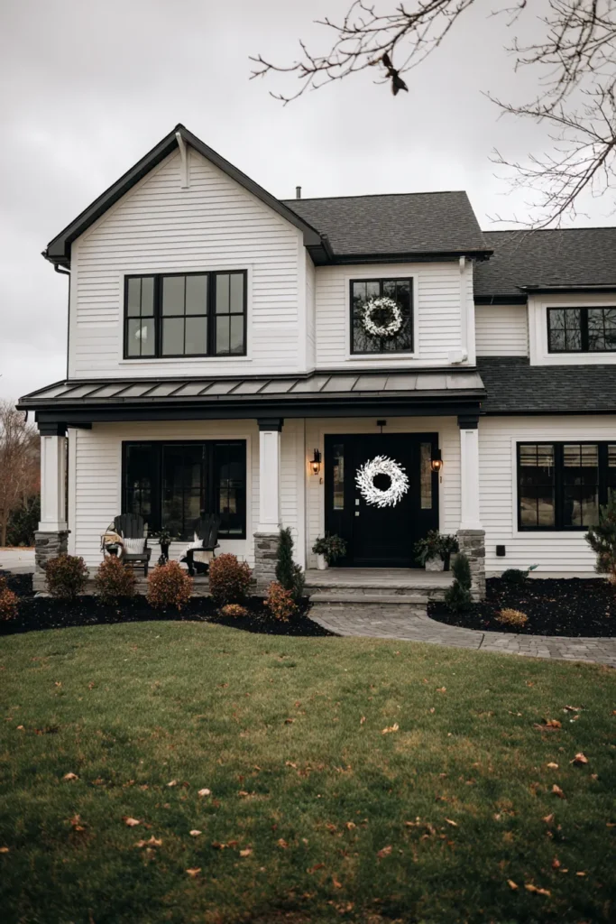 This modern farmhouse proves that black and white will always be a classic pair. The crisp white siding contrasts beautifully with the bold black window frames and front door, creating a clean, timeless look. Matching white wreaths add a touch of holiday cheer without taking away from the home’s sleek architecture. A few cozy touches, like plaid blankets draped over Adirondack chairs and soft outdoor lighting, make the entryway feel welcoming and festive.