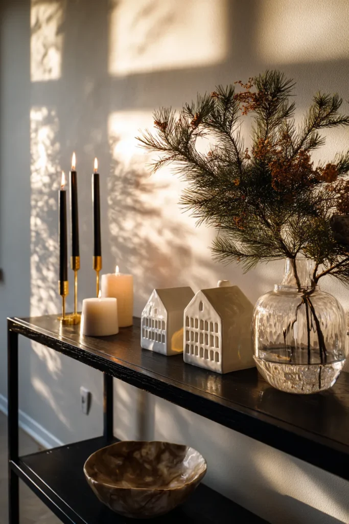 This black console table looks effortlessly chic with its simple mix of neutral tones and warm candlelight. Black taper candles in gold holders bring in a sophisticated edge, while white pillar candles and ceramic house ornaments soften the look. A clear glass vase filled with pine branches adds that subtle touch of Christmas greenery without overwhelming the space. The way the evening light hits the wall and reflects off the glass makes everything feel calm and cozy at the same time.